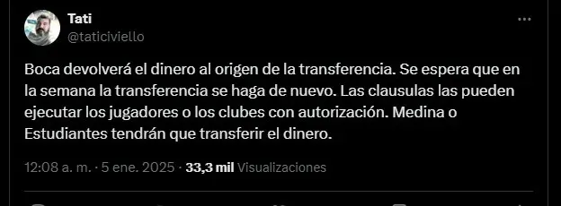 Según reveló el periodista Claudio Civiello, Boca devolvería el dinero de la transferencia de Cristian Medina a la cuenta de origen de donde salió. Y durante la semana, se espera que el pago se realice nuevamente.