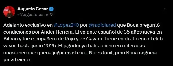 Según reveló el periodista Augusto Cesar en Radio la Red, Boca preguntó condiciones por el jugador de Athletic Bilbao. En España, el jugador tiene contrato hasta junio del 2025.