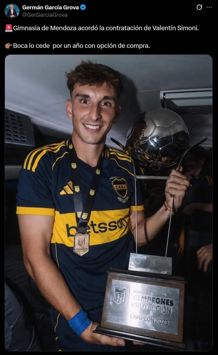 Sin embargo, nunca pudo hacer su debut profesional con la camiseta del Único Grande. Y ahora, tiene todo definido para jugar en Gimnasia de Mendoza. El periodista Germán García Grova informó que Boca llegó a un acuerdo con el elenco cuyano y cederá a Simoni por un año, sin cargo y con opción de compra.