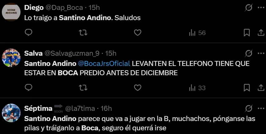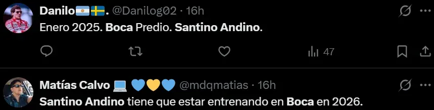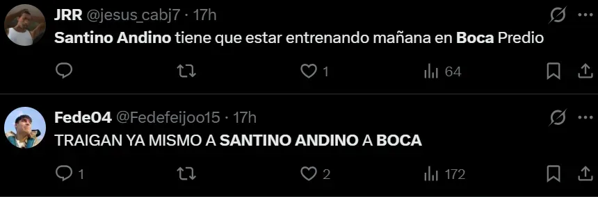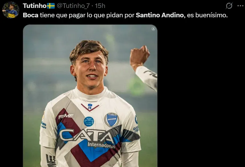 En ese sentido, los hinchas de Boca no tardaron en aparecer haciéndole un claro pedido a Juan Román Riquelme: incorporar al joven delantero para el 2026. “Ya debería estar haciéndose la revisión médica con Boca”, “Boca tiene que traer y apostar fuerte por Santino Andino”, “Tienen que pagar lo que pidan por Santino Andino, es buenísimo”, fueron algunos de los comentarios que los fanáticos postearon en redes.