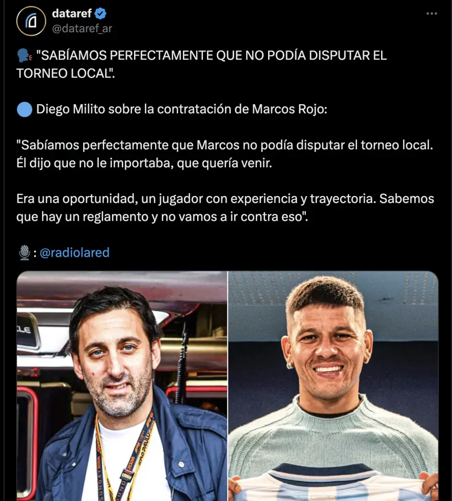 Ante esta situación, Diego Milito fue duramente criticado por los hinchas de Racing en las redes sociales. Y para tener una respuesta a tal papelón mayúsculo, el dirigente soltó una inédita declaración: argumentó que ya sabía que Rojo no podía jugar y que lo contrató de todas formas.