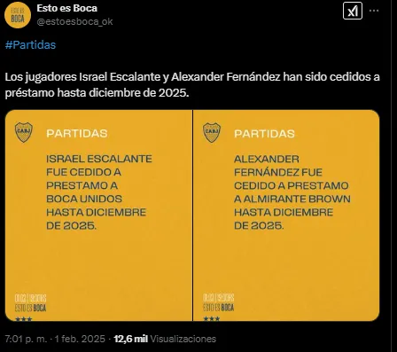 La cuenta oficial “Esto es Boca” confirmó que Israel Escalante fue cedido a Boca Unidos (Federal A) hasta fin de año y Alexander Fernández a Almirante Brown (Primera Nacional), en la misma condición y por el mismo tiempo.