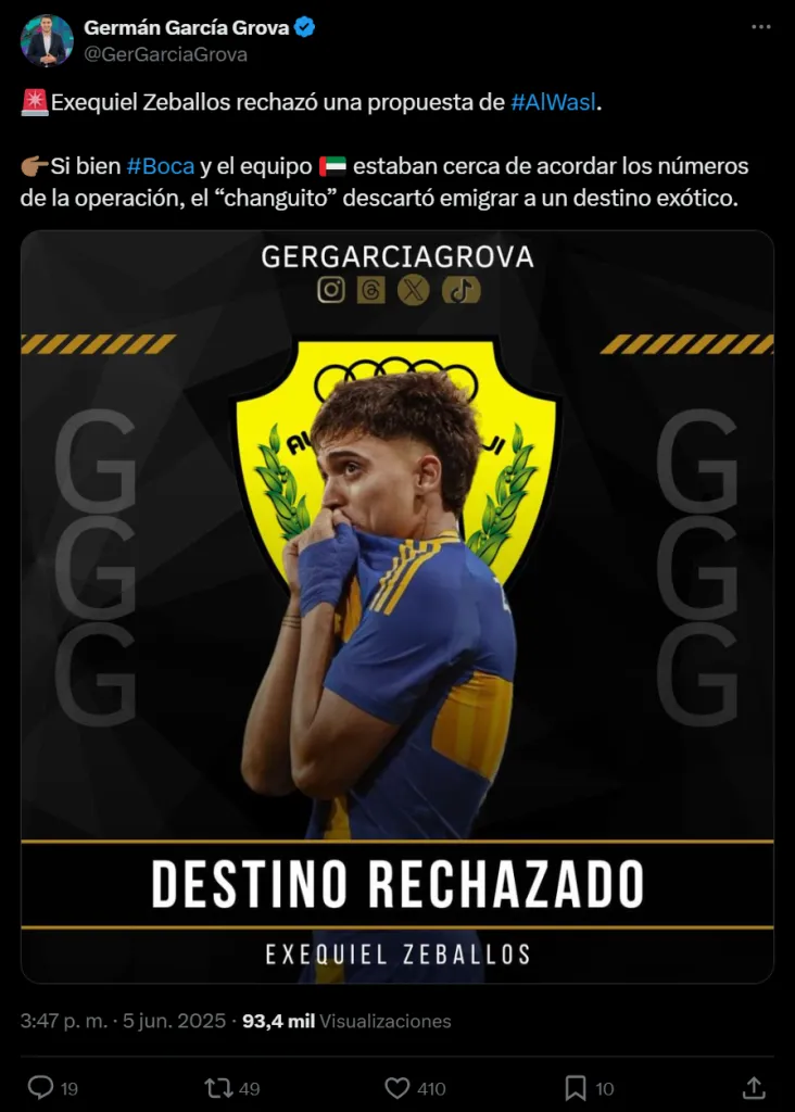 Pero no fue el único equipo de una liga exótica que acercó una oferta. Según informó el periodista Germán García Grova, el Al Wasl, equipo donde dirigieron Diego Maradona y Rodolfo Arruabarrena, hizo una propuesta formal de 9 millones de dólares. Y aunque ambos clubes estaban acercándose a un acuerdo, el jugador decidió desestimar la oferta.