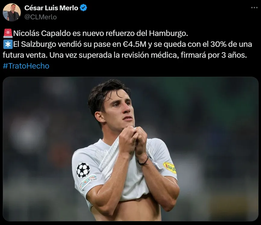 Capaldo se marchó de Boca en 2021 para jugar en el Salzburgo. El mediocampista se afianzó en el equipo austríaco desde entonces y se convirtió en una pieza clave. Incluso estuvo a punto de disputar el Mundial de Clubes, pero una lesión lo terminó dejando afuera.