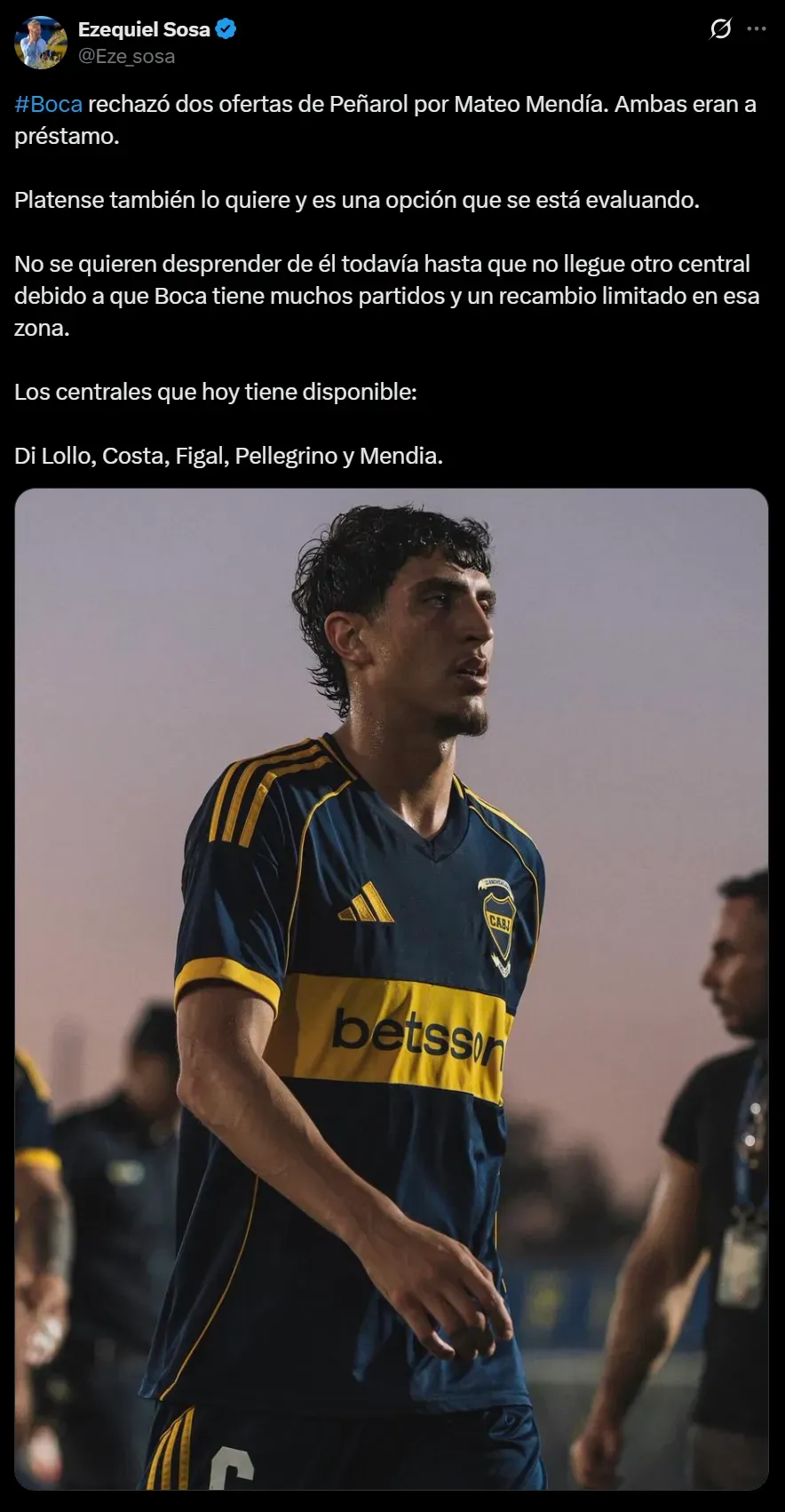 El periodista Ezequiel Sosa reveló en su cuenta de X (Twitter) que Boca rechazó dos ofertas de Peñarol por Mendia. La intención del conjunto uruguayo era sumarlo a préstamo. A su vez, Platense es otro de los equipos que lo viene siguiendo al jugador hace tiempo y el Único Grande analiza el ofrecimiento.