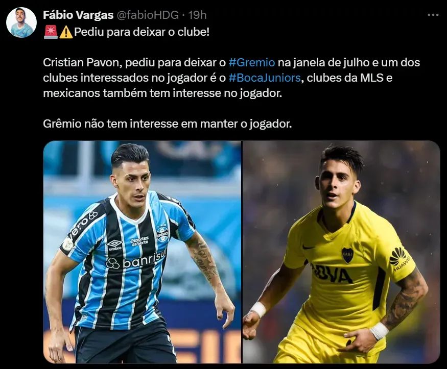 Y es que según el periodista partidario Fábio Vargas, Pavón le habría pedido a la dirigencia de Gremio salir en el próximo mercado de pases en junio. A su vez, por el lado del club de Porto Alegre, no tendrían intenciones de retener al jugador, y estarían abiertos a negociarlo. Lo inesperado es que según la fuente citada, Boca es uno de los equipos que estaría interesado en volver a contar con sus servicios.