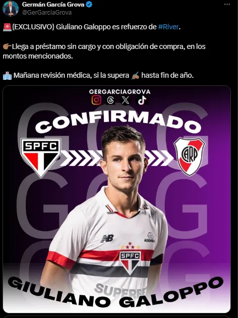 El periodista Germán García Grova de Bolavip reveló que el volante llega al Millonario a préstamo con obligación de compra y se hará la revisión médica. El Xeneize había negociado con el equipo brasileño y, si bien llegaron a un acuerdo, el mediocampista eligió llegar a la vereda de enfrente.