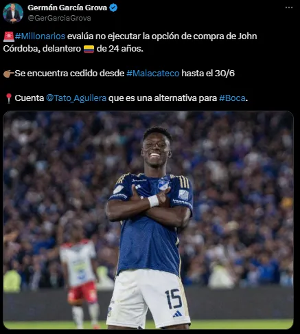 Uno de los extremos apuntados es John Córdoba, hoy futbolista de Millonarios. Sin embargo, según reveló el periodista Germán García Grova de Bolavip, el jugador está cedido en el equipo colombiano hasta el 30 de junio.