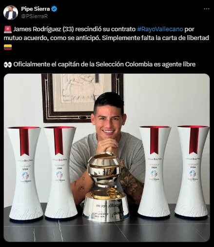 El futbolista tiene 33 años y donde mejor rindió en el último tiempo fue en la selección de Colombia, a la que guió hasta la final de la Copa América 2024. Con el pase en su poder, el zurdo ahora debe decidir su destino, y justamente el regreso a su país es una posibilidad concreta.