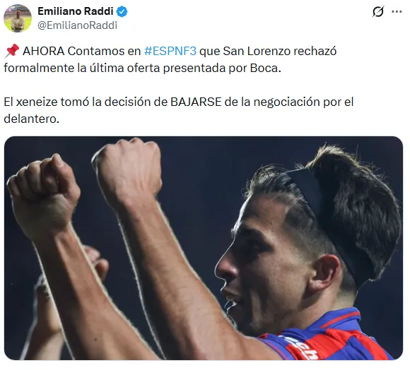 Según reveló el periodista Emiliano Raddi de Planeta Boca Juniors, la dirigencia de San Lorenzo rechazó la última oferta del club por 3 millones de dólares por el 60% de la ficha. Por tal motivo, Boca se bajó de la pelea por contratar al delantero.