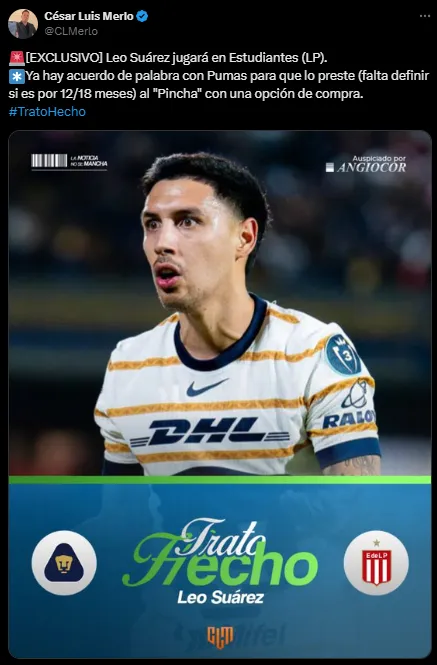 Ahora, según confirmó el periodista César Merlo, el futbolista volverá al país desde Pumas de México para vestir la camiseta de Estudiantes. El equipo platense visitará La Bombonera el fin de semana del 2 de noviembre por el Torneo Clausura.