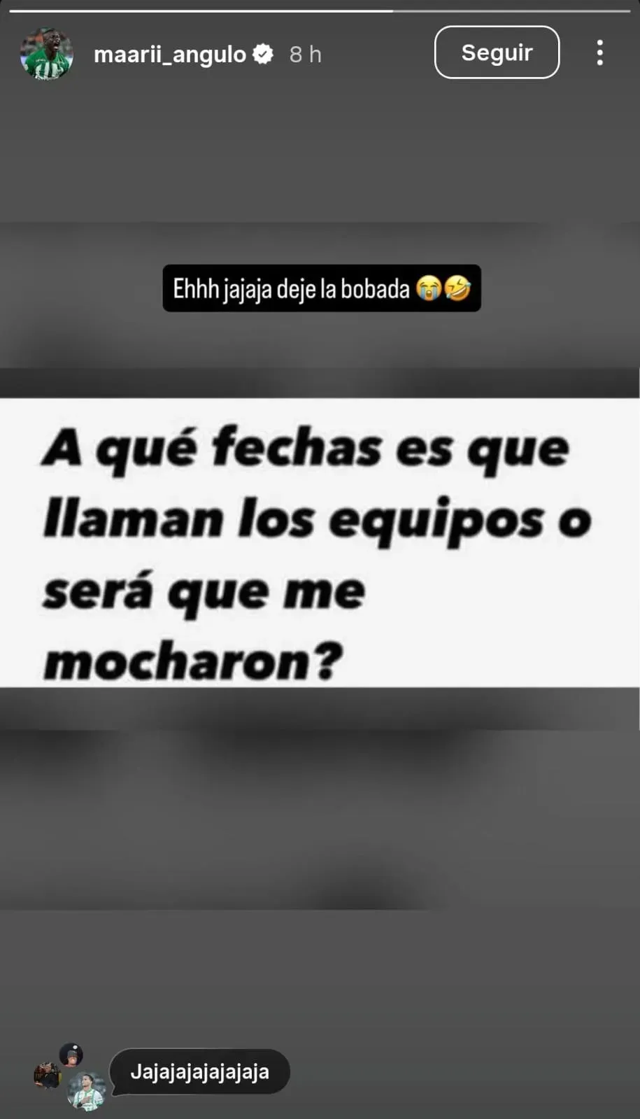 Más arriba en la imagen, el colombiano se auto respondió: “Ehhh jajaja deje la bobada“. El comentario viene a colación de que el Verdolaga empieza hoy su pretemporada y debe presentarse.