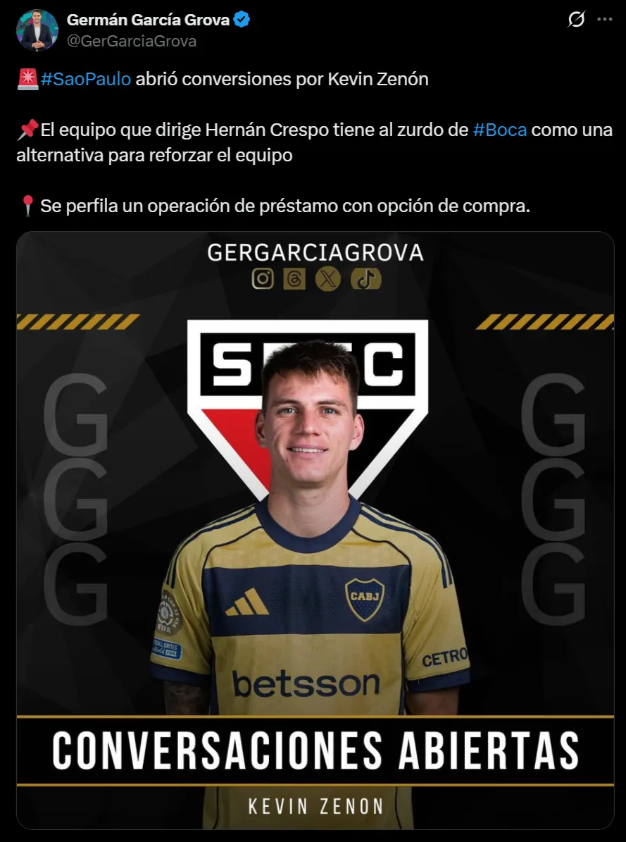Según informó el periodista Germán García Grova en su cuenta de X (Twitter), el elenco paulista abrió negociaciones con Boca para adquirir a Zenón en este mercado. La fuente citada indicó que los brasileños quieren al jugador a préstamo con una opción de compra.