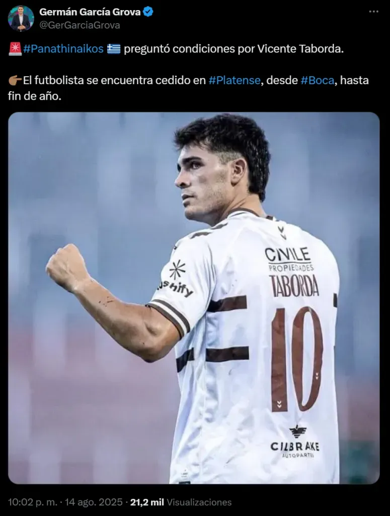 El periodista Germán García Grova reveló en su cuenta de X (Twitter) que el equipo griego preguntó condiciones a Platense por el futbolista surgido en Boca. Aunque no se sabe la respuesta del elenco de Vicente López, Taborda está a préstamo desde Boca hasta fines de este año.