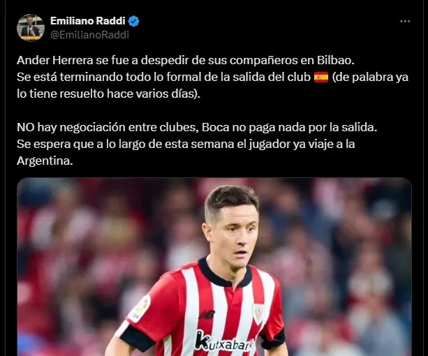 Según reveló el periodista Emiliano Raddi para Planeta Boca, el cuadro de la Ribera no deberá pagar por el pase de Ander Herrera. Ya que el jugador rescindirá su contrato en Athletic Bilbao por lo que llegará en condición de libre.