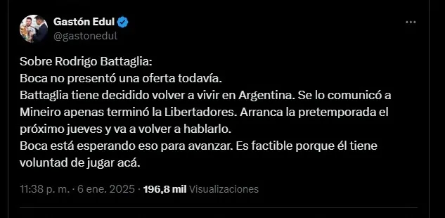 Con este contexto, el periodista Gastón Edul dio detalles sobre la postura de Battaglia respecto a su futuro en Brasil. Y reveló que el jugador tiene decidido regresar a la Argentina y que hablará esto con los dirigentes de Atlético Mineiro el próximo jueves, día en el que arranca la pretemporada.