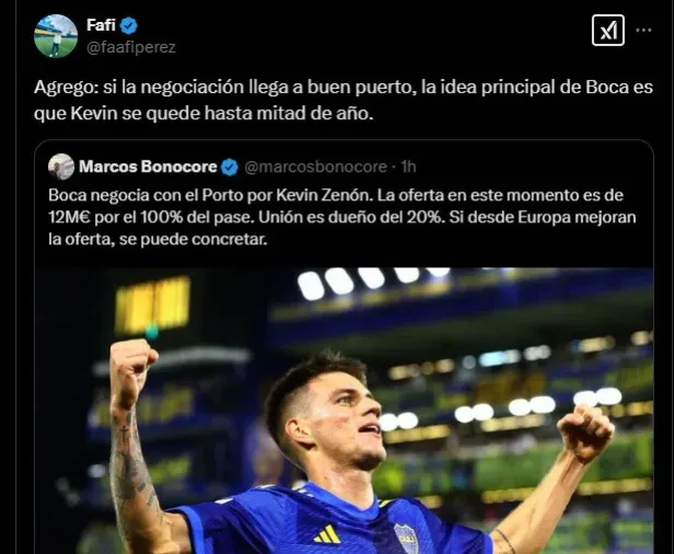 Según reveló el periodista Facundo Pérez, Boca pretende que Kevin Zenón se quede hasta mitad del 2025 en caso de que las negociaciones con Porto lleguen a buen puerto. Y por ende, el equipo de Fernando Gago podría disfrutar 6 meses más del volante ofensivo en caso de ser vendido.