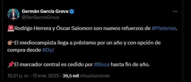 Según reveló el periodista Germán García Grova, Oscar Salomón saldrá nuevamente a préstamo del Xeneize al Calamar. Y la operación se dará por una cesión por una temporada, es decir hasta finales del 2025.