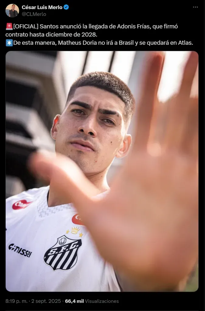 El Santos de Brasil atraviesa un delicado momento en la liga local. Es por eso que tras haber contratado a Juan Pablo Vojvoda como nuevo DT, quieren reforzar el plantel. En ese sentido, el “Peixe”, anunció oficialmente el arribo de Adonis Frías al equipo.