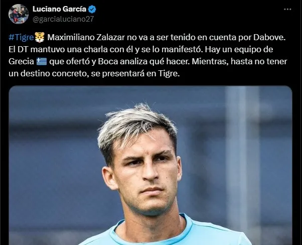 Uno de estos nombres es el de Maximiliano Zalazar, delantero que actualmente se encuentra en Tigre a préstamo. Pero se reveló que no será tenido en cuenta allí, por lo que podría tener otro posible destino, ya que en Boca tampoco tendría lugar con Russo: el fútbol de Grecia.