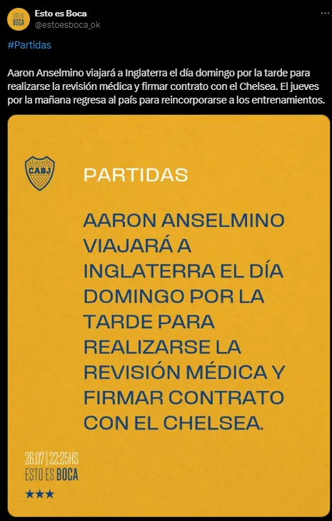 Raúl Cascini y Marcelo Delgado viajarán junto a Aaron Anselmino a Inglaterra para que se haga la revisión médica para ser jugador del Chelsea. El club inglés abonará 18 millones de dólares más otro monto en objetivos por el defensor central de 19 años. Se quedará a préstamo en Boca por un año y el club londinense tiene la chance de repescarlo en diciembre en caso de que lo requieran. Según anunció la cuenta Esto es Boca el futbolista regresará el jueves al país para reincoporarse a los entrenamientos.