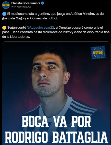 Según reveló el periodista Augusto César en Radio La Red, el Xeneize tiene negociaciones avanzadas para adquirir la totalidad del pase de Rodrigo Battaglia, volante del Atlético Mineiro. Puede jugar tanto de mediocampista central como de defensor.