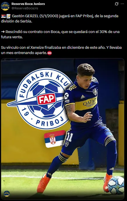 Según reveló la cuenta Reserva Boca Juniors, el volante ofensivo rescindió su contrato con la institución y se irá al FAP Priboj de la segunda división de Serbia. En la firma, se acordó que Boca cobre el 30% de una futura venta.