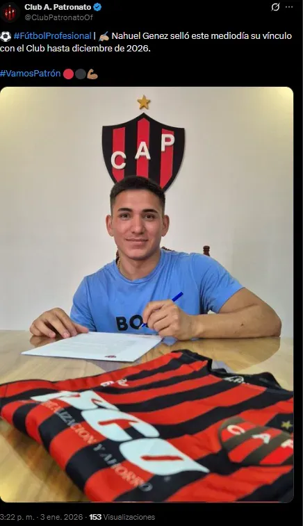 La cuenta oficial de Patronato acaba de confirmar que se llevó cedido por un año a Nahuel Genez, de último paso por Temperley. El lateral izquierdo, devenido a volante durante la última temporada en el Gasolero, pasó al equipo paranaense hasta diciembre de 2026.
