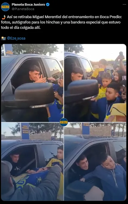 Miguel Merentiel salió muy enojado contra Huracán y siguió el segundo tiempo desde el vestuario. Tras el entrenamiento de este martes, la Bestia salió con su camioneta y lo esperaban varios hinchas. Uno le hizo una bandera muy especial que el uruguayo terminó firmando y se fotografió con otros niños presentes.