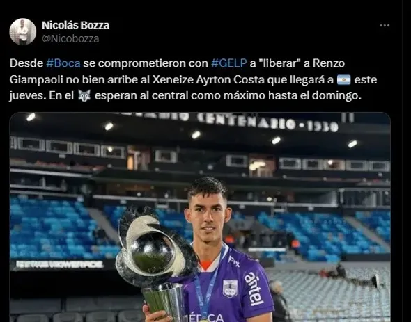 Ante esta situación, el periodista Nicolás Bozza reveló que desde Boca se comprometieron a liberar a Renzo Giampaoli para que juegue en Gimnasia de la Plata. Y desde desde el portal 0221.com.ar informaron que su salida se daría con un préstamo con opción de compra y una repesca a favor del Xeneize.