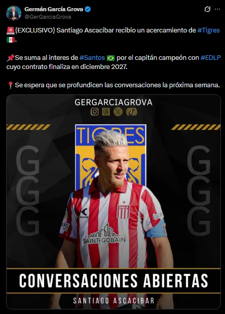 Según reveló el periodista Germán García Grova de Bolavip, el capitán de Estudiantes podría irse a Tigres de México. El Santos también se interesó en él pero el conjunto norteamericano hizo un acercamiento para llevárselo.