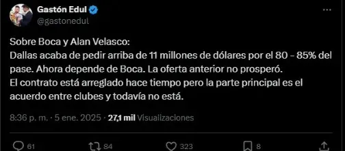 Según contó Gastón Edul, FC Dallas pidió 11 millones de dólares por el 80/85% de la ficha. De esta manera, el Consejo de Fútbol deberá responder si acepta o no esta contraoferta que presentaron los estadounidenses. Además, el periodista añadió que el contrato con el jugador está resuelto hace tiempo, pero aún resta el acuerdo entre los clubes.