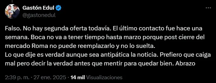 “Boca no se comunica hace una semana y todavía no llegó esa segunda oferta contractual“, informó Gastón Edul. “Boca no va a tener tiempo hasta marzo porque post cierre del mercado Roma no puede reemplazarlo y no lo suelta“, aclaró también el cronista. ¿Y ahora?
