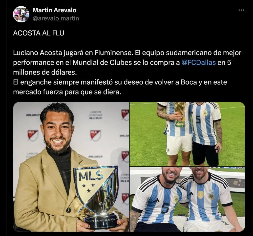 El periodista Martín Arévalo confirmó que Luciano Acosta será nuevo jugador del Fluminense de Brasil. Y de esta manera, el delantero jugará en el equipo que superó a Boca hace un par de años en la final de la Copa Libertadores.
