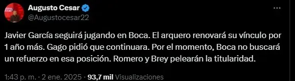 Según informó el periodista Augusto César, Javier García renovará su contrato con Boca. Y por pedido de Fernando Gago, el arquero estará en el Xeneize por un año más.
