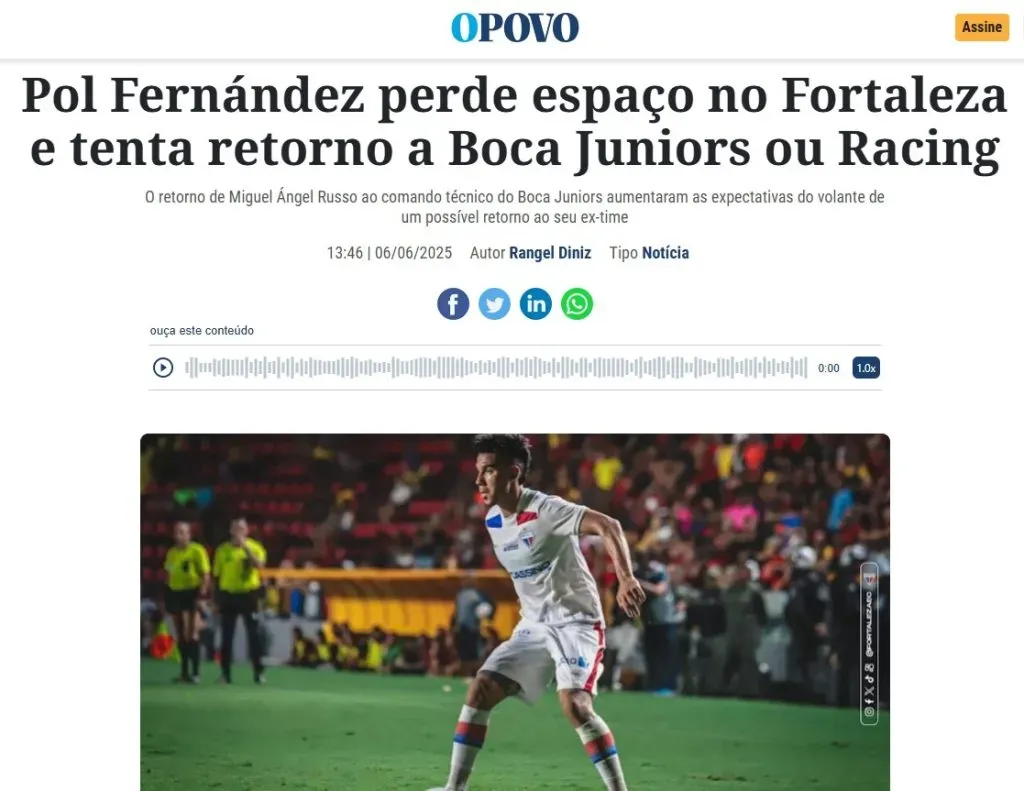 Y las declaraciones de uno de sus dirigentes son una prueba de esta sorprendente postura. Hace unos días, Sérgio Papellin, nuevo director deportivo del cuadro de Ceará, habló sobre Pol y analizó: “En primer lugar, no conozco personalmente a Pol Fernández, no tuve la oportunidad de hablar con él. Es un jugador al que seguí mucho cuando jugaba en Boca”.
