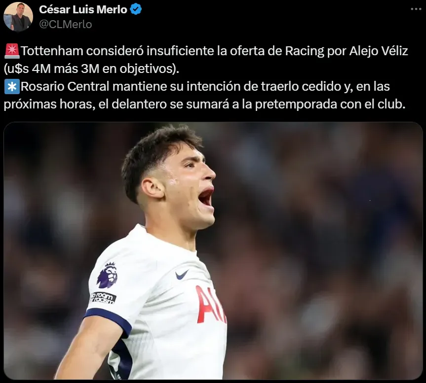 Veliz fue dirigido por Russo en Rosario Central y fue una de las grandes apariciones del Canalla campeón en 2023. Su rendimiento lo depositó en el fútbol de Inglaterra para vestir la camiseta del Tottenham. Pero desde su llegada, jugó poco y ahora los “Spurs” quieren negociarlo. En ese sentido, se conoció que rechazaron una oferta importnate por el jugador.