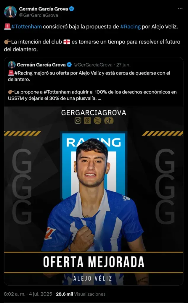 Los periodistas César Luis Merlo y Germán García Grova confirmaron que el Tottenham rechazó una oferta mejorada de Racing por Véliz que consistía en 4 millones de euros más 3 millones en objetivos. Por lo que el delantero seguirá hasta el momento en el equipo británico y hará la pretemporada allí.