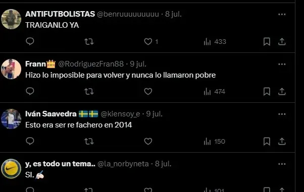 Una de ellas tiene al ex hombre de la Roma junto a Luciano Acosta, actual jugador del F.C. Dallas de la MLS. Y los hinchas ni siquiera lo dudaron y pidieron también su regreso: “Ahora le toca a él“, “Lotrai“, y “Banco a las piñas“.