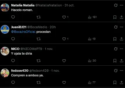 “Hacelo Román“, “Ojalá“, “Compren a ambos ya“, fueron algunas de las respuestas de los hinchas de Boca ante el planteo de Sebastián Neman, periodista que cubre el día a día de Independiente.