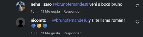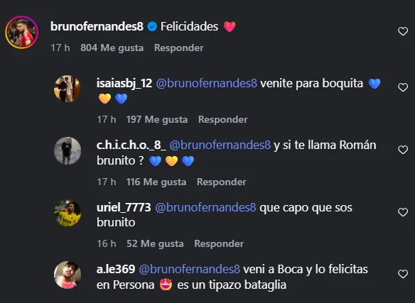 “Venite para Boquita“, “¿Y si te llama Román, Brunito?” y “Vení a Boca y lo felicitás en persona” son algunos de los comentarios de los simpatizantes, “intentando” convencerlo para que puede jugar en el Único Grande.