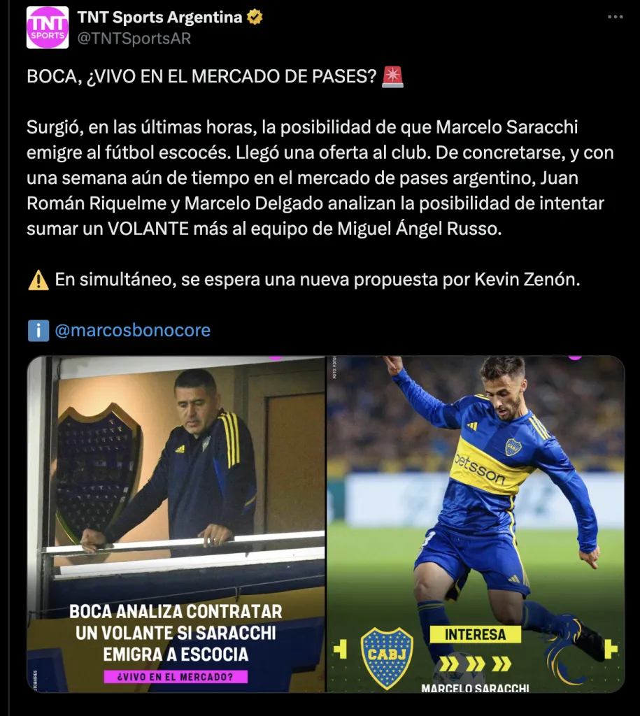 Y así lo contó la cuenta de TNT Sports en “X”: “Surgió, en las últimas horas, la posibilidad de que Marcelo Saracchi emigre al fútbol escocés. Llegó una oferta al club. De concretarse, y con una semana aun de tiempo en el mercado de pases argentino, Juan Román Riquelme y Marcelo Delgado analizan la posibilidad de intentar sumar un volante más al equipo de Miguel Ángel Russo“.