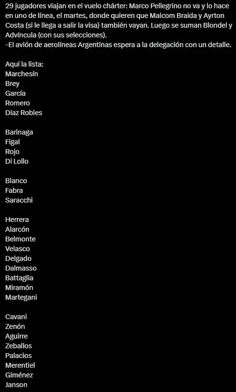 El último, incorporado a principios del 2025, todavía no pudo obtener su visa para entrar a Estados Unidos. Si bien no viajará con todo el plantel, tienen la esperanza de resolver su situación y mientras tanto permanecerá en la lista de buena fe. Si le conceden el permiso, viajará durante la próxima semana.