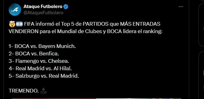 De esta manera, los 2 partidos que el equipo de Fernando Gago jugará en Miami fueron los más vendidos de toda la competencia. Y con esto, Boca reafirma que es el club que más entradas vendió para el Mundial de Clubes. Por otro lado, el top 5 de partidos con más entradas vendidas son Flamengo vs. Chelsea, Real Madrid vs.Al Hilal y el Salzburgo contra el Real Madrid.
