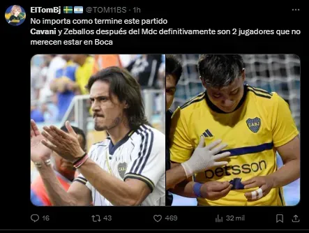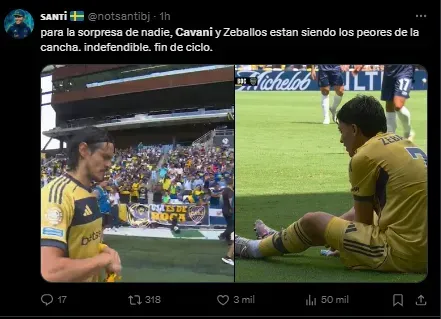 Por su rendimiento en el campo de juego, Edinson Cavani también fue apuntado por los hinchas de Boca. Y tras la eliminación, los Xeneizes no ocultaron su enojo con el delantero quien recién regresó para jugar este partido contra el cuadro amateur: “Papelón”, “exjugador”, y “Indefendible”.