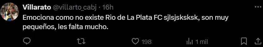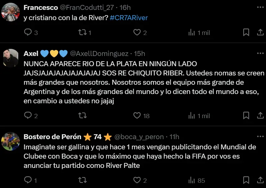 Y ahora volvió a suceder. En una nueva publicación aludiendo a los 7 días que quedan para el inicio del torneo, aparecieron diversos jugadores que lucen ese número, entre ellos Exequiel Zeballos. Pero Matías Rojas, que lleva ese dorsal en el Millonario, no aparece. Al notar este detalle, los hinchas no lo dejaron pasar. “Riber no existe para Infantino” y “Basta pongan a riBer en algún lado por favor ya me siento mal por semejante club diminuto”, fueron algunos de los comentarios mofándose del eterno rival en X (Twitter).