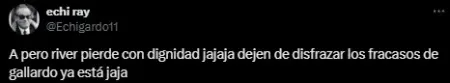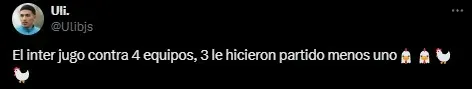 En todo este torneo, el “Millonario” fue el único equipo que no le marcó al cuadro italiano y en “X” (Twitter) aparecieron muchísimos comentarios con cargadas para el equipo de Marcelo Gallardo. En el Único Grande resaltaron que el “Flu” se le animó a Lautaro Martínez y compañía, y los dejó expuestos. “Inter solo existió para eliminar a River“, “Fracaso Monumental” o “Dejen de disfrazar los fracasos de Gallardo“, fueron algunos de los comentarios.