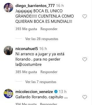 Sin embargo, esto pareció no importarle a los hinchas de Boca en las redes sociales. Y los Xeneizes no dudaron en burlarse del entrenador de River en los comentarios: “Ya está llorando”, “Son de manual”, y “Contala como quieras”.