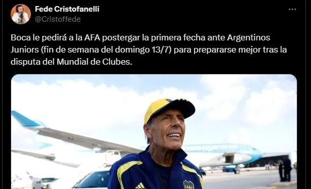 Y así contó la información el periodista Federico Cristofanelli en Infobae: “Desde la Ribera se comunicarán con la AFA para pedir la postergación del primer compromiso en el Torneo Clausura contra Argentinos Juniors en La Paternal, que según las fechas del calendario está pactado para el fin de semana del domingo 13 de julio. La excepción se pedirá por el tardío descanso tras el Mundial de Clubes“.