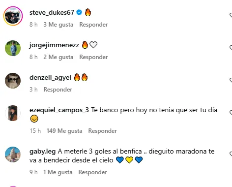 “Ahora a meterle 3 goles al Benfica“, “Hacele 3 al Benfica y te perdono“, “No le querés clavar 5 al Benfica?“, fueron algunos de los mensajes que le dejaron al delantero en su última publicación de Instagram.